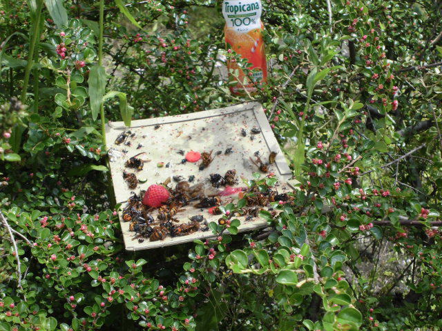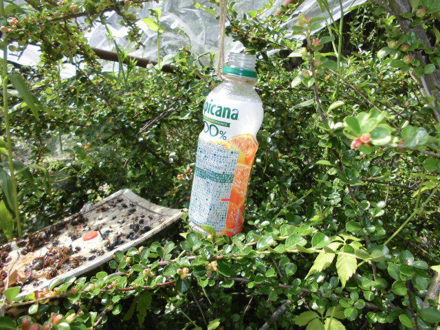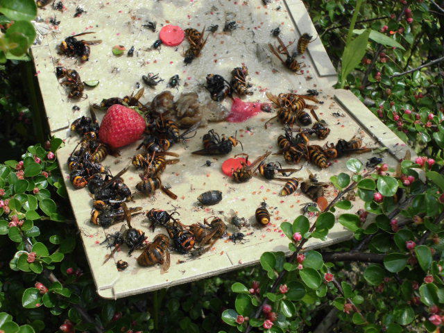 捕獲結果 コガタスズメバチ40匹以上、キイロスズメバチ10匹以上、その他少数でクロスズメバチ、アシナガバチ、コアシナガバチ等合計60匹以上は捕獲でき、蜂の活動期になっても近くでは巣を確認していません。 |